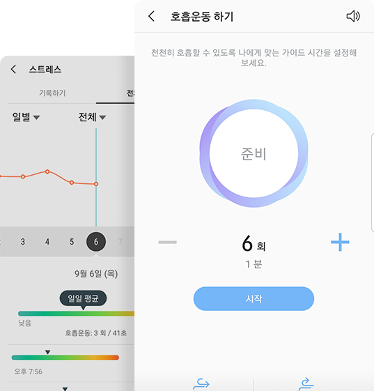 * 해당 국가의 법률에 따라 스트레스 및 심박수 기능이 제공되지 않는 국가가 있습니다. 갤럭시 스마트폰과 웨어러블 중